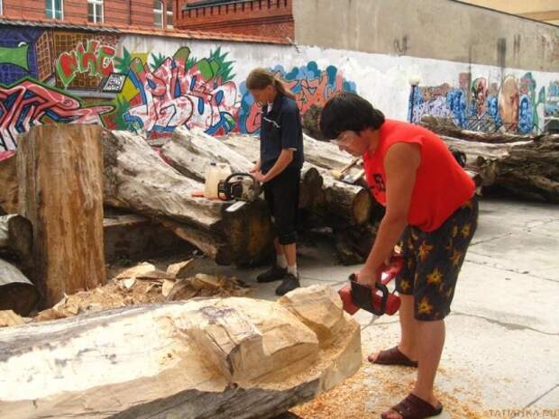 Поначалу мастер намечает главные формы будущей статуи, делая это как зачищать резьбу на дереве засечкой топором больших плоскостей; позже более непосредственно отрабатывает силуэт и все части фигуры широкими полукруглыми и поболее маленькими стамесками, и, в конце концов, делает окончательную отделку поверхности, снимая узкую стружку богородским ножиком, оканчивающимся треугольным как зачистить резьбу по дереву скосом и отточенным до остроты бритвы. Завершают декоративную отделку поверхности ритмичные бороздки, сделанные при помощи маленьких стамесок.